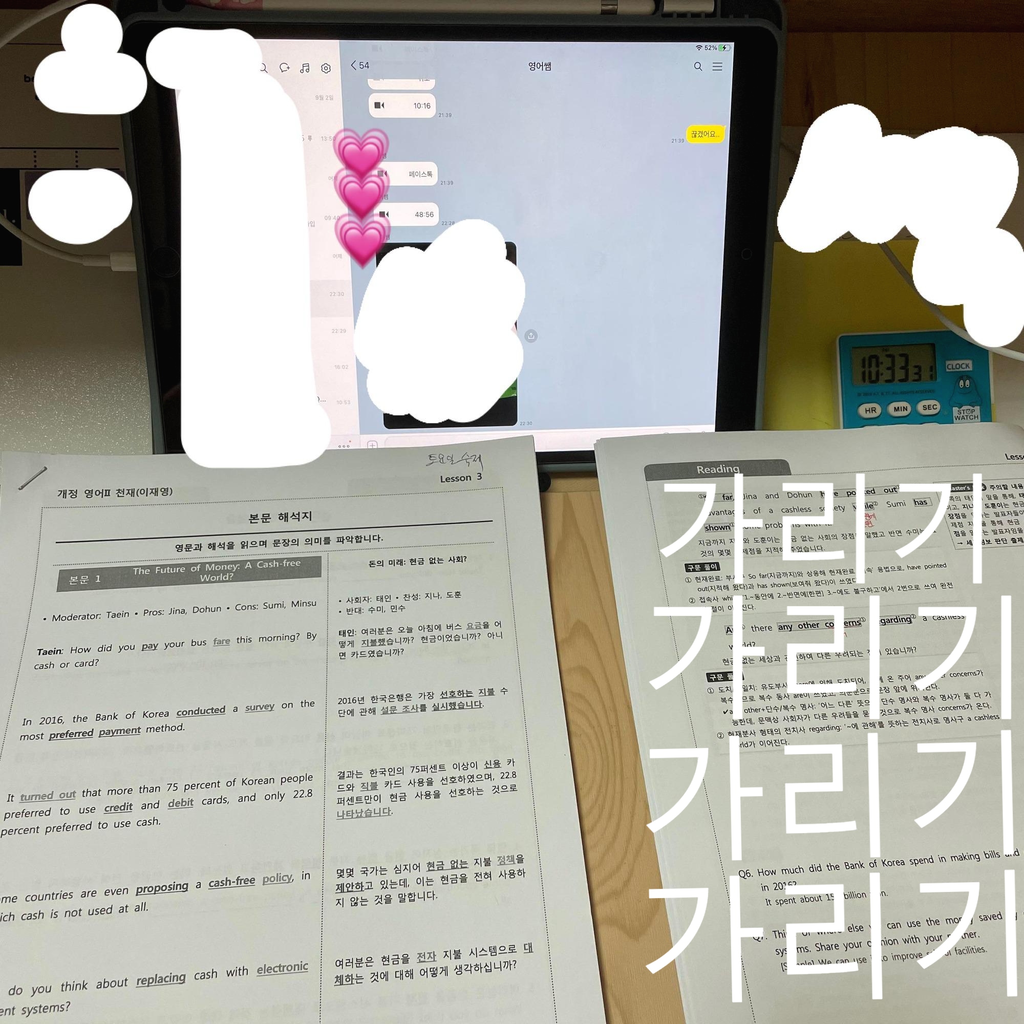 그리고 (영어) 카카오톡 페이스톡으로 수업할 때는 연결이 한 번 끊겨서 다시 하고
